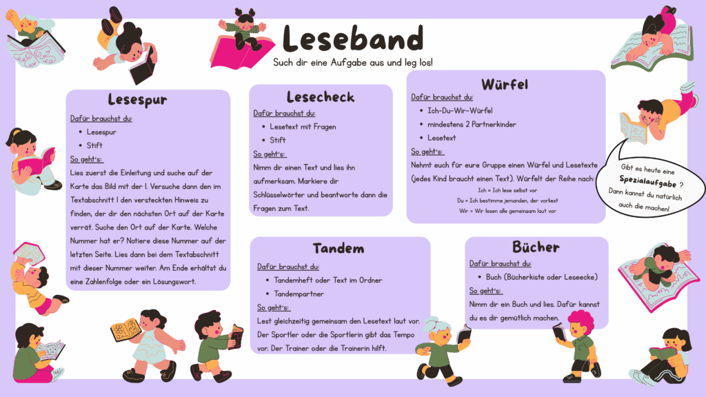 Seit dem Schuljahr 2024/2025 nimmt unsere Schule am Startchancen-Programm teil. In diesem Rahmen findet täglich das sogenannte Leseband statt. Das Leseband ist eine fest verankerte Zeit im Stundenplan, in der alle Schüler*innen einer Klasse 20 Minuten im Unterricht sowohl die Leseflüssigkeit als auch das Leseverständnis trainieren. Hierbei werden täglich unterschiedliche Methoden genutzt, um sowohl das selbstständige Lesen als auch das gemeinsame Lesen zu fördern. Im folgenden können Sie sich anhand der Methodenkarte, die die Schüler*innen erhalten, einen kleinen Überblick über einige der Methoden verschaffen.